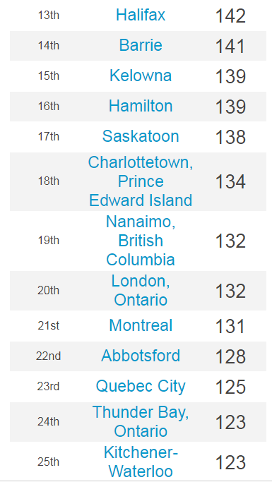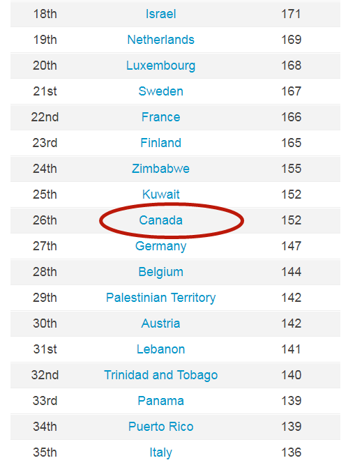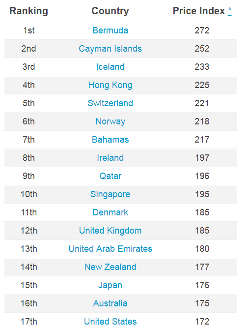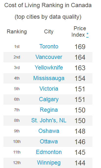 我们先来看看加拿大在世界各国的生活成本中的排名。( 各城市的生活成本排名与该国的货币汇率之间存在一定程度的趋同。)