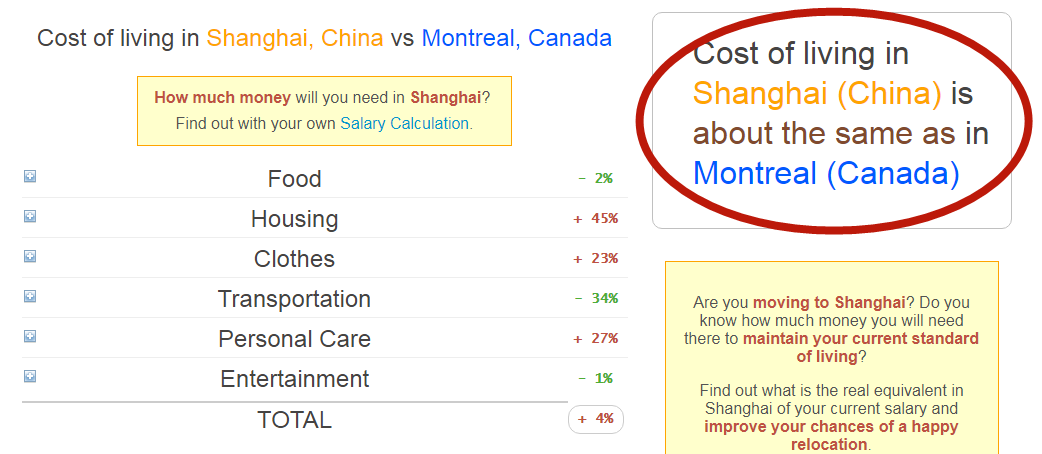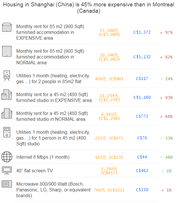 蒙特利尔和上海在生活成本上最为相似。 蒙特利尔和上海在住房方面的生活成本比较。