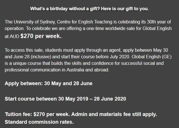 为庆祝悉尼大学语言中心成立 30 周年,推出 Global English 课程 270 澳元 / 周的优惠价格,要求如下: