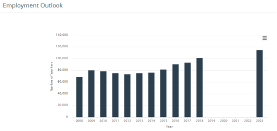 建筑行业仅此于金融与采矿业,是澳大利亚的第三大产业,站到全澳GDP的8%。根据澳洲政府官方数据Job Outlook,施工经理项目经理就业增长非常强劲,预计从2018年的100900增长到2023年114300,近5年内有可能产生54000个职位空缺。