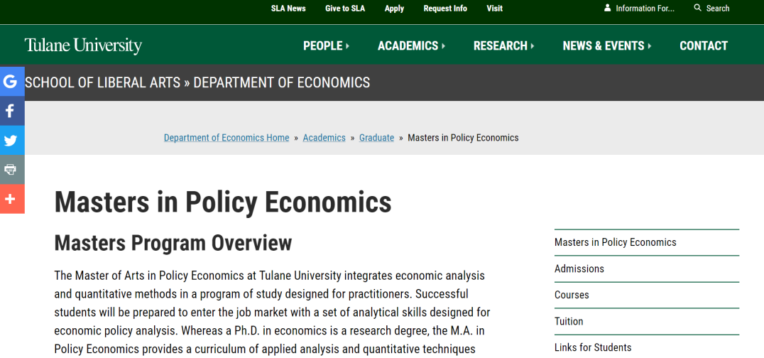 杜兰大学(Tulane University)政策经济学硕士将经济分析和定量方法结合在一个为从业者设计的研究项目中。成功的学生将为进入就业市场做好准备,具备一套旨在进行经济政策分析的分析技能。经济学博士是一个研究学位,而政策经济学硕士提供了一个应用分析和定量技术的课程,更适合经济学从业者。