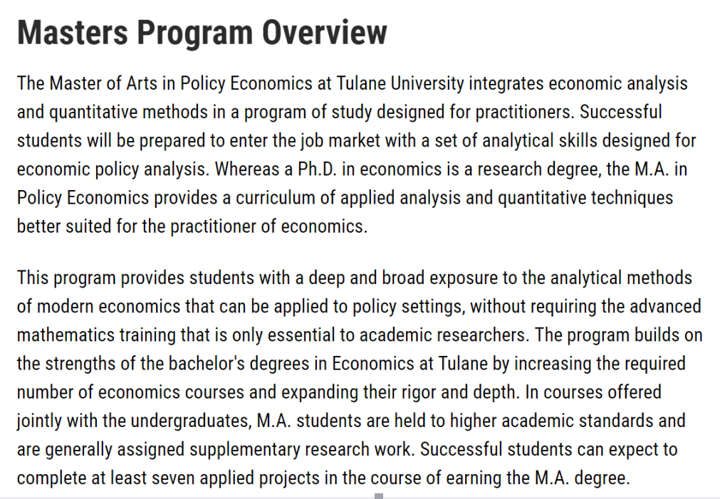 该项目为学生提供了一个深入和广泛的接触,现代经济学的分析方法,可以应用到政策设置,而不需要高等数学训练,这是只有学术研究人员必不可少的。该项目以杜兰大学经济学学士学位的优势为基础,增加了经济学课程的必修数量,并扩大了课程的严谨性和深度。在与本科生共同开设的课程中,硕士学生被要求达到更高的学术标准,并通常被分配补充研究工作。成功的学生在获得硕士学位的过程中可以完成至少七个申请项目。