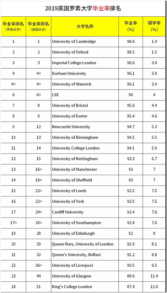 非罗素大学里,圣安德鲁斯大学、皇家农业大学、巴斯大学的毕业率表现也很出众,在 95% 以上。 优秀的的毕业率也需要各位同学努力完成学业,稳扎稳打,用优异的成绩创造自己美好的未来。