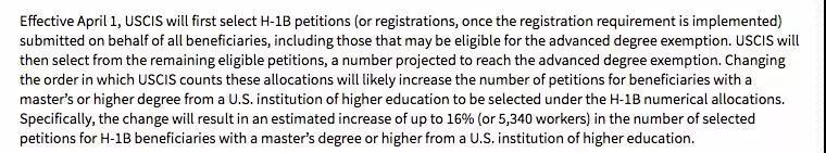 这个重大的改变,有助于在有限的 H-1B 名额内,使硕士及以上学历者被抽中比例增加 16% ,约有 5,340 人。