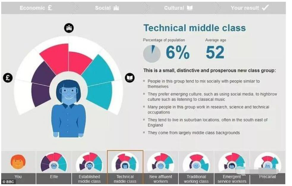 技术型中产阶层:这一阶层占人口的6%,是一个规模不大却特色明显的新兴阶层类型,经济资本相对富有但同时社会和文化资本积分略有不足。这一阶层的人多从事技术及研发工作,社交层面相对有局限并对文化生活也追求有限。