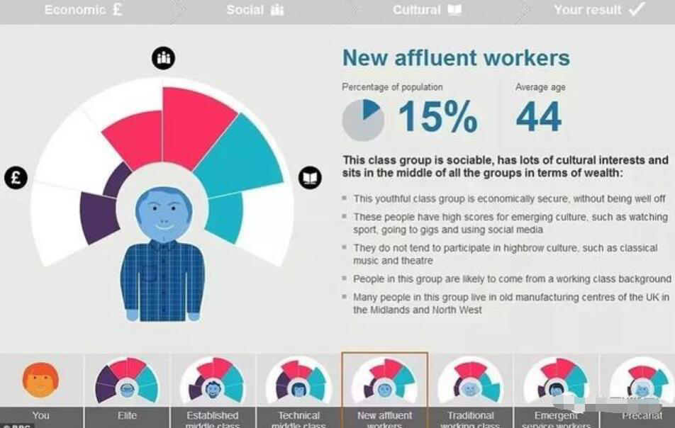新型富有工作者:这一阶层占人口的15%,拥有中等的经济资本,但却有较高的文化和社会资本。这一阶层的人多出身于英国西北部的工人阶级家庭;热衷于各种体育赛事和社交媒体,拥有中等收入和经济资本水平。
