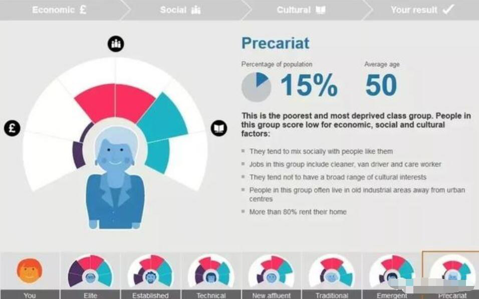 传统工人阶级:占总人口14%,平均年龄66岁,是当下平均年龄最高的阶级。在各项资本中得分均不高,但他们却不是最穷的那部分人,大多数人拥有自己的房产。他们喜欢和与自己出身相似的人群交往,较为保守,不喜欢去健身房,也不爱社交媒体。