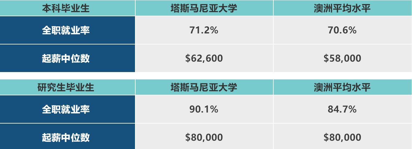 塔斯马尼亚毕业生就业率及起薪均高于澳洲平均水平。本科毕业生全职工作的就业率是71.2%,平均工资$62,600。硕士毕业生全职就业率90.1%,平均工资$80,000。(数据来自Grauate Destinations Survey 2015 an Grauate Outcomes Survey 2016-2017)