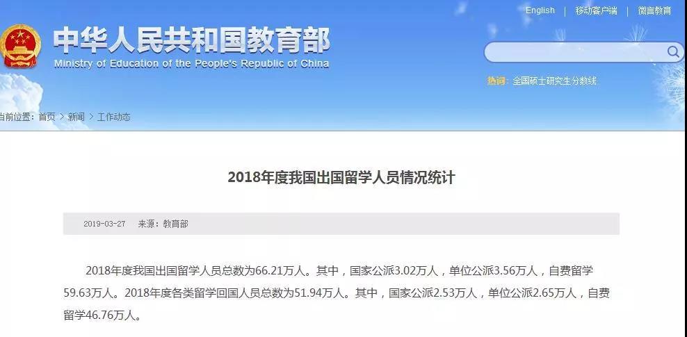 2018年度我国出国留学人员总数为66.21万人。其中,国家公派3.02万人,单位公派3.56万人,自费留学59.63万人。2018年度各类留学回国人员总数为51.94万人。其中,国家公派2.53万人,单位公派2.65万人,自费留学46.76万人。