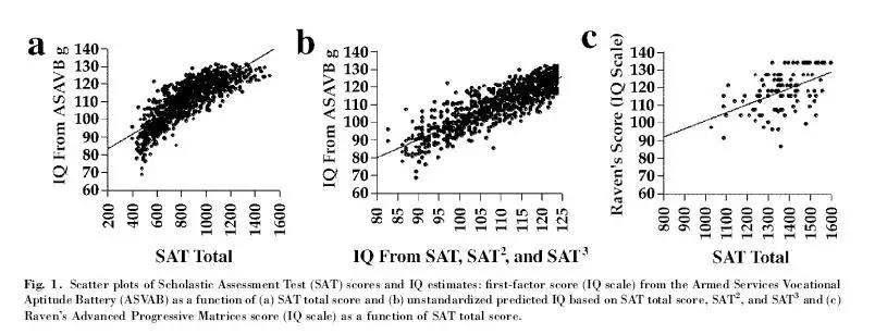 根据Frey和Detterman在2004年的一项研究指出,SAT分数与智商测试想要测量的一般智力因素(G)之间有很强的相关性,相关性已经达到0.82(分值区间是0-1)!尽管让人难以相信,但这却是事实……他们因此得出了一个有效结论:SAT成绩是反映智商的一项重要标准。
