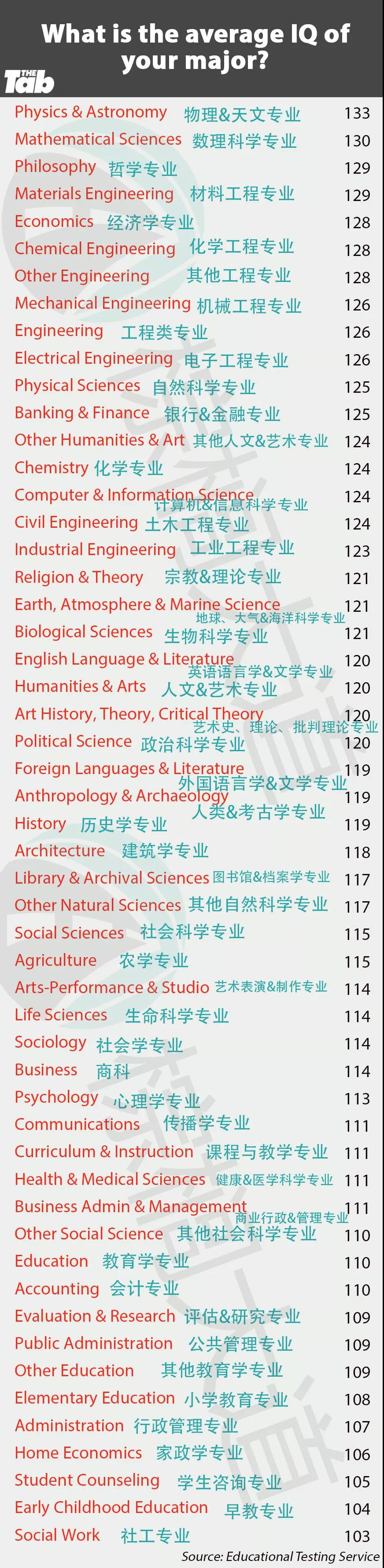 ETS根据不同专业学生的SAT考试成绩数据,统计了美国大学不同专业的平均IQ指数。