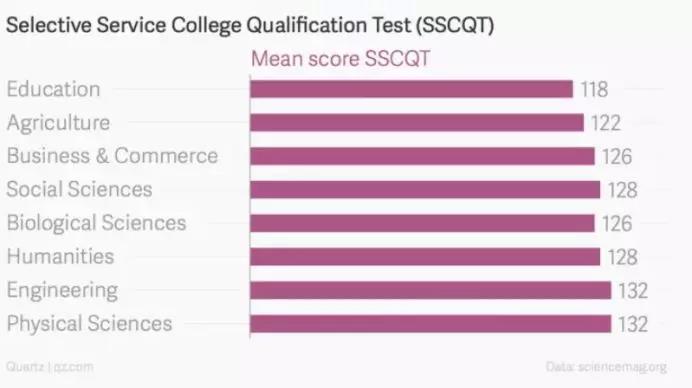 也就是说,在过去七十年,STEM专业始终霸占了IQ能力(学术能力)最强的学生,而学习教育专业学生的IQ水平,虽然达到了平均IQ水准,但一直处于专业类别的最底层。