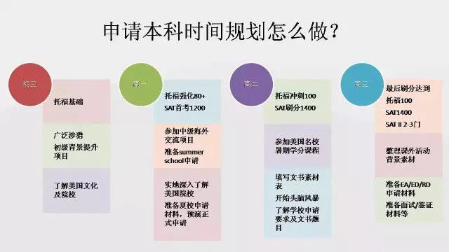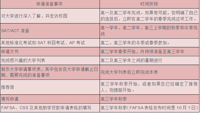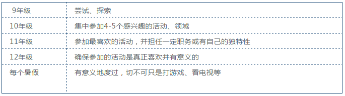 以上是标化成绩和申请部分。但是我们知道“活动规划”也是你申请的“利器”。那么如何规划自己的活动呢? 因为每个人的空余时间不同,开始规划的时间也不一样。一般来说,活动规划如下表: