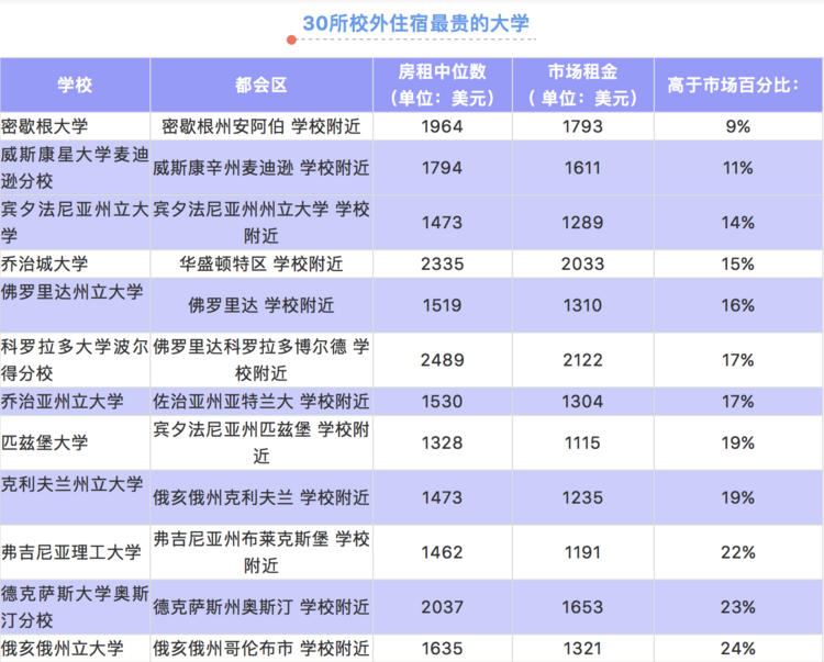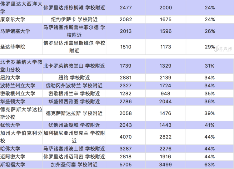 通过以上数据,我们可以看出,在加州大学洛杉矶分校(UCLA)租金高于市场百分比最高,斯坦福大学和迈阿密大学周围两英里以内租金也不逊色。所以大家在找住处的时候也要慎重考虑啊,可以看看稍微远一点的地方,或者找个靠谱的人合租。
