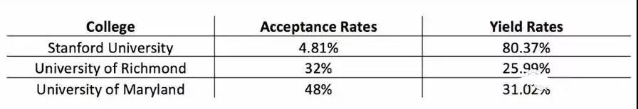 如上所示,斯坦福大学的录取率不到5%,在这些被录取的学生中,有超过80%的人会决定入学;里士满大学的录取率为32%,但Yiel Rate仅仅是26%;马里兰大学的录取率和Yiel Rate则分别为48%和31%。因此我们很容易推断出, 美国录取难度最大的学校通常具有最低的录取率,但也拥有最高的Yiel Rate ,这意味着大多数被这些学校录取的学生最终会选择入学。