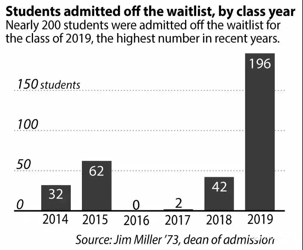 每年各个学校的Yiel rate都不同,WL的转正情况每年也有较大差异。 这里以达特茅斯为例,我们可以看到起WL的数量波动非常大,有的年份Dartmouth会从WL上挑出近200名学生转正,而有的时候一个转正的学生都没有。