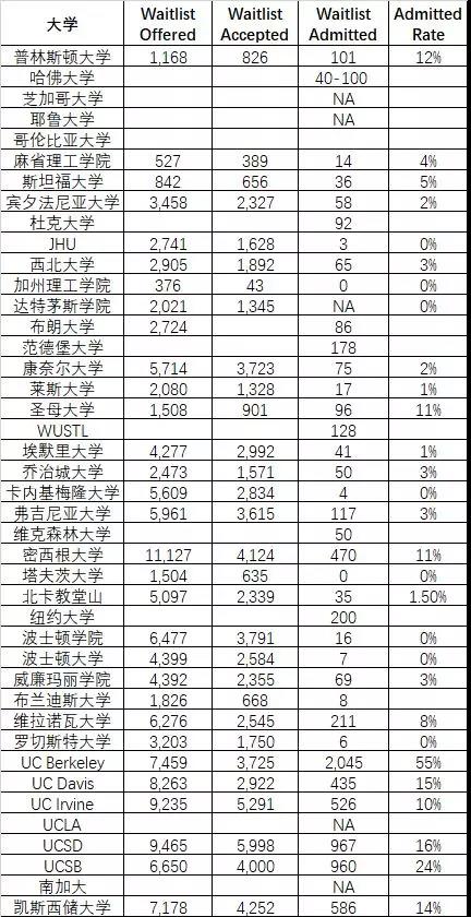 上表的数据仅供参考,因为学校每年的WL转正情况都是不同的,比如你不能指望普林斯顿大学每年都有100+的学生从WL转正,去年有101人转正纯属小概率事件。