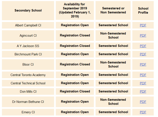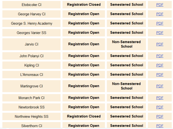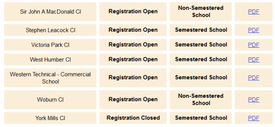 以下是TDSB(多伦多公立教育局)的名额情况,Registration Open表示目前还有名额,RegistrationClose 表示学校名额已满,申请已经关闭。