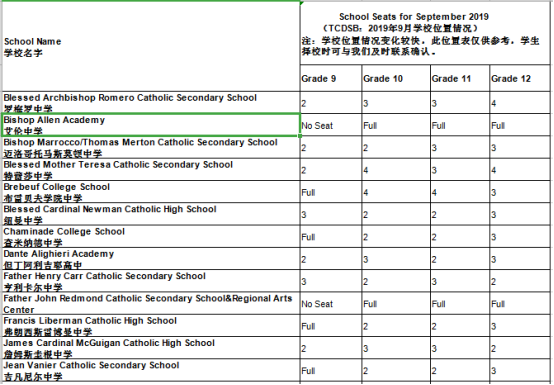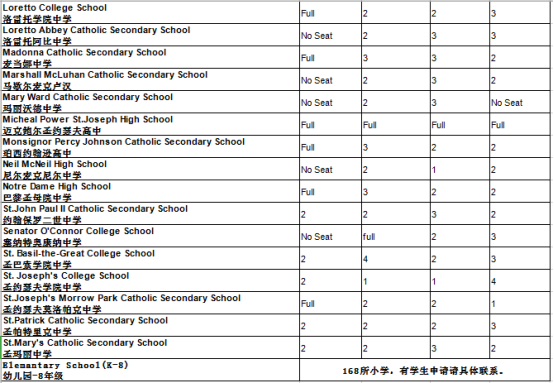 TCDSB(多伦多天主教公立教育局)名额如下: