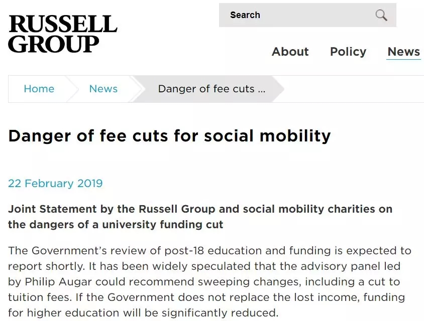 二月下旬,罗素大学集团联合几家慈善机构发表声明称,若政府打算降低学费,但不拨款填补大学的收入损失,学校经费不足,恐怕只能被迫缩减招生人数了。