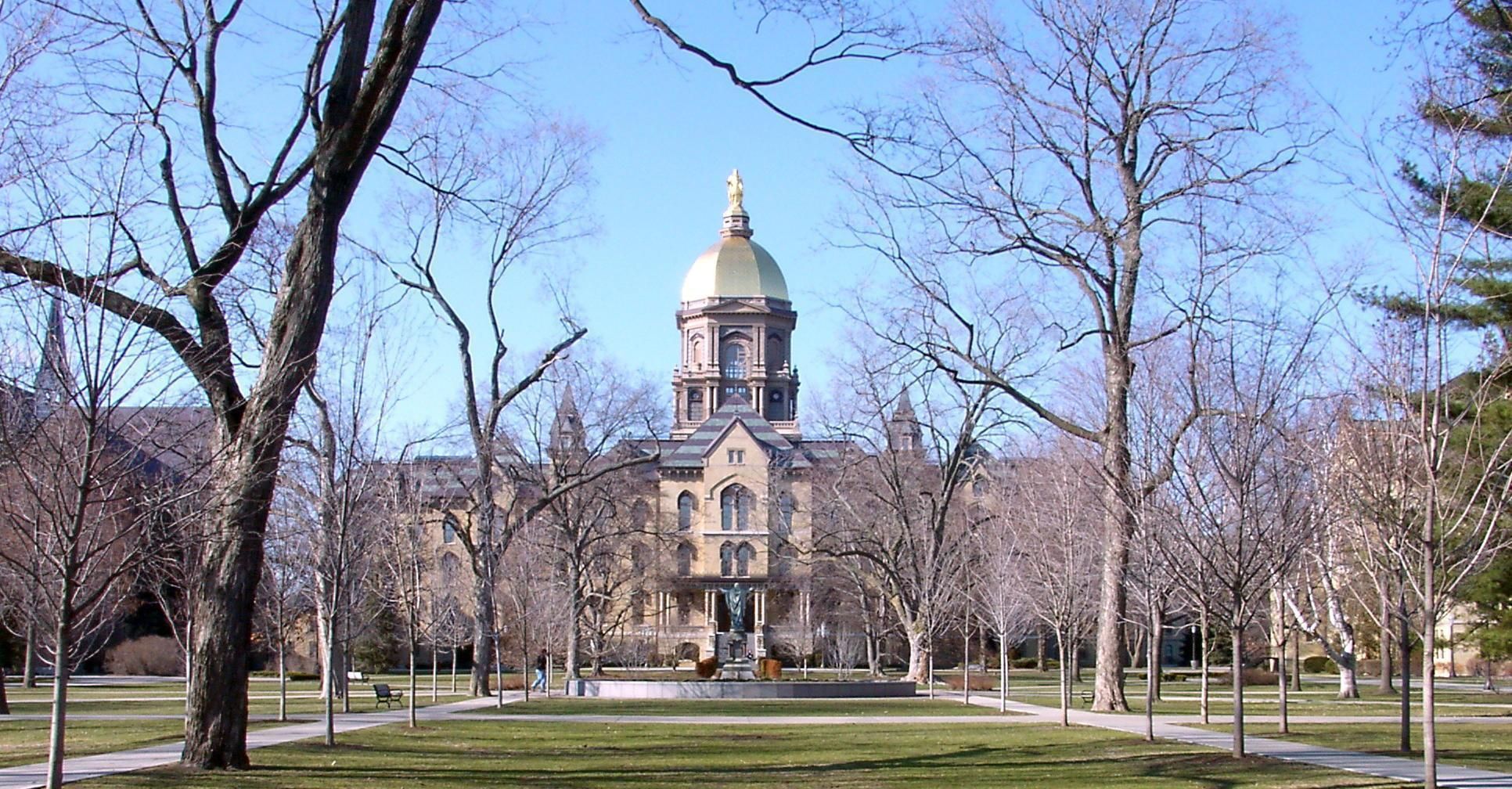 圣母大学学校环境优雅,镀金的金色圆顶和主楼顶上的玛丽雕像宣布圣母大学的校园是一个信仰珍贵和多样化传统、共享尊重的地方。从通往附近的芝加哥和印第安纳波利斯的道路,以及南本德的街区都可以看到金色圆顶。