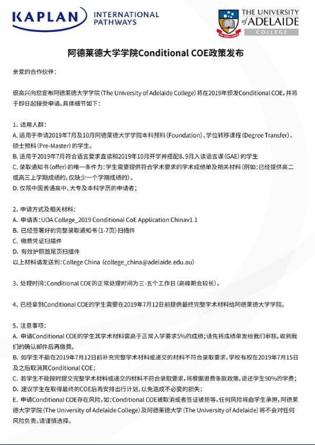 阿德莱德大学学院Aelaie College本科预科,学位转移以及硕士预科课程,针对 2019 年 7 月及 10 月主课入学的学生,无法提前提供完整学术材料的情况下,推出 Conitional CoE 政策,以便学生提早缴费办理签证手续。
