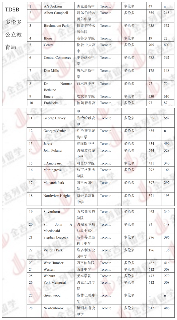 Toronto District School Boar (TDSB) 加拿大多伦多公立教育局是由7所多伦多教育局在1998年1月合并而成的,是目前加拿大规模最大的教育局,在北美洲亦居前位;目前有30万学生,1.6万名教师。位于多伦多市(加拿大第一大城)北美最安全的城市之一; 下属共有 558 所公立学校,其中: 451 所提供小学及初中教育, 102 所提供高中教育,另外还有 5 所成人学校; 每年接近二分之一左右的高中毕业生因总 平均达到八十分以上而被授与安省优等生荣誉。