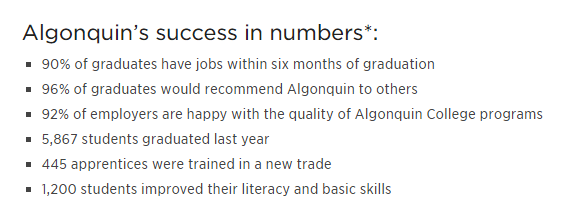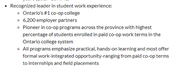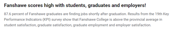 4.范莎学院有近50个带薪实习(co-op)专业,为学生提供获得社会实践的机会,对学生毕业后在加拿大找到理想的工作起到至关重要的作用。范莎学院87.6%的学生在毕业之后半年之内找到工作。另外,雇主对于学生的满意度,以及学生对学校的满意度都名列前茅。