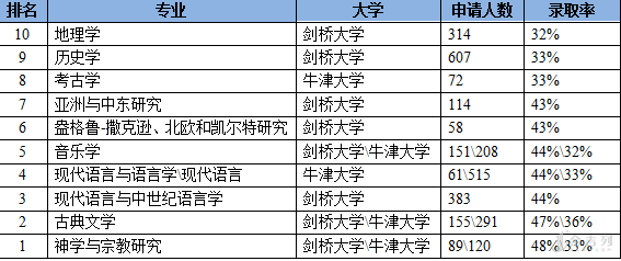 不难发现这十个申请成功率均在30%以上的专业有两个共同特点: 基本都在人文科学领域,这类学科对申请者的专业技能和教育背景不像理工科,医科或者商科,法律的招生要求那么高 另一个特点是这些申请人数基数相对较少 那么,看完这个表格之后,大家是不是信心倍增,其实牛剑也不是像大家想想的那么遥不可及,世界顶级学府正在康河的粼粼波光中向你招手呢。 今年没有申上的小伙伴可以考虑看看来年再拼一次,还没有申请的小伙伴们可以开始信心满满的开始准备了,说不定明年九月你就在牛津大学,剑桥大学报到了!