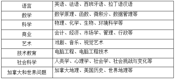 学校提供安省整套中小学课程,其中高中和大学预科课程包括: