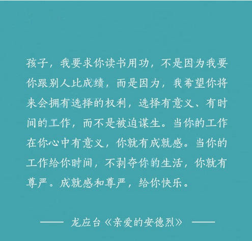杨澜讲过一句话:“我很爱我的孩子,但我不能照顾他一辈子,不能帮他去听,帮他去看,更不能在20年后帮他去竞争;我唯一能做的就是给孩子一个学习的机会,给他创造一个好的学习环境,给他一个健康,强健的身体,让他拥有竞争的能力,从而更好地面对未来的工作和学习,去创造机会和财富 “。