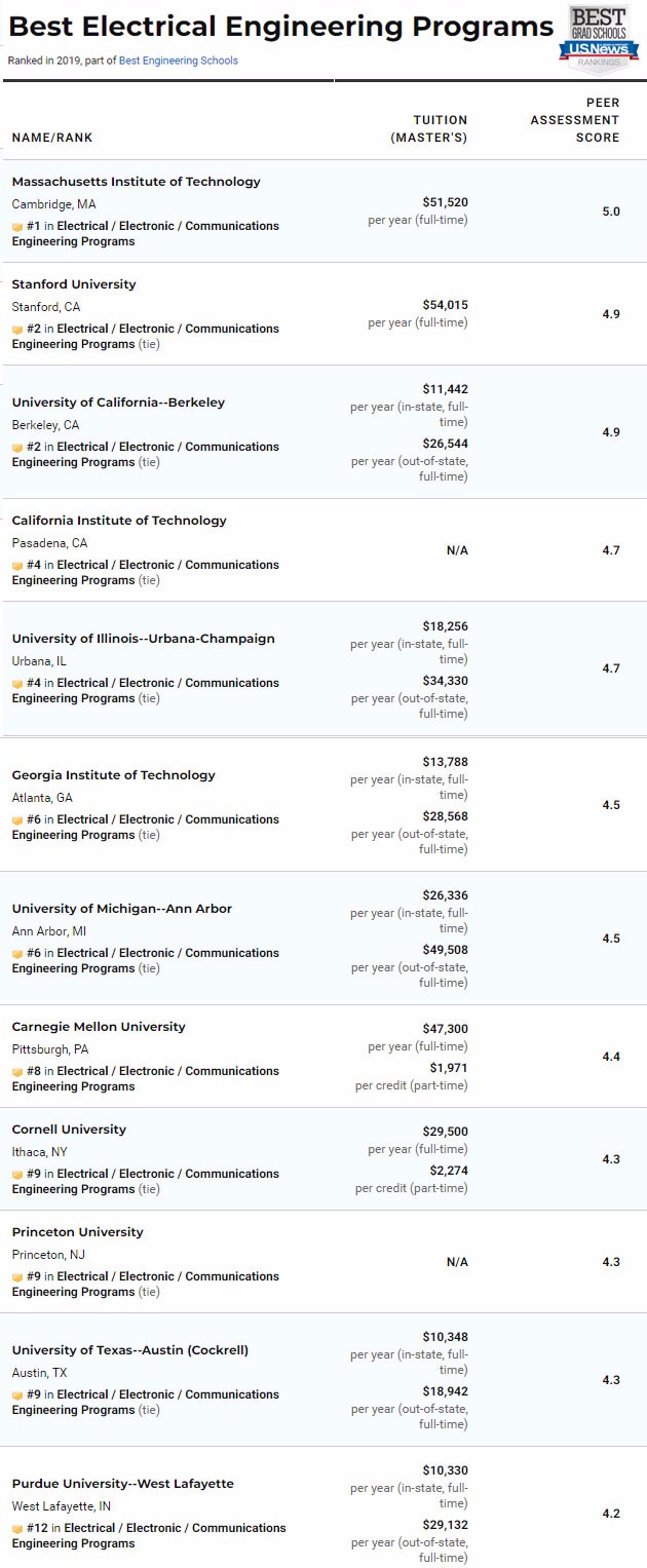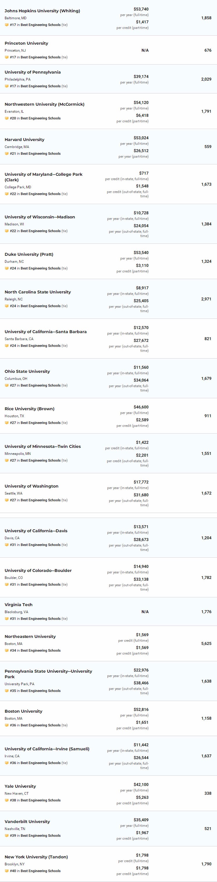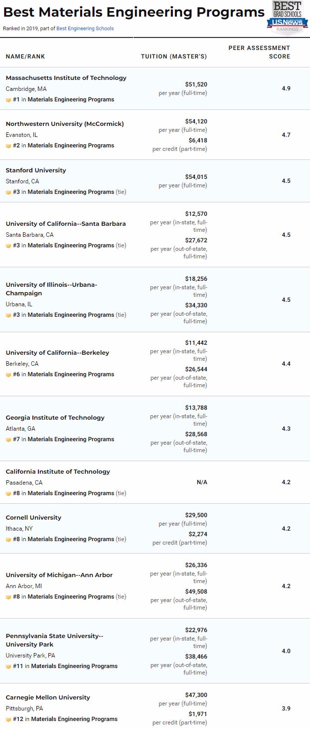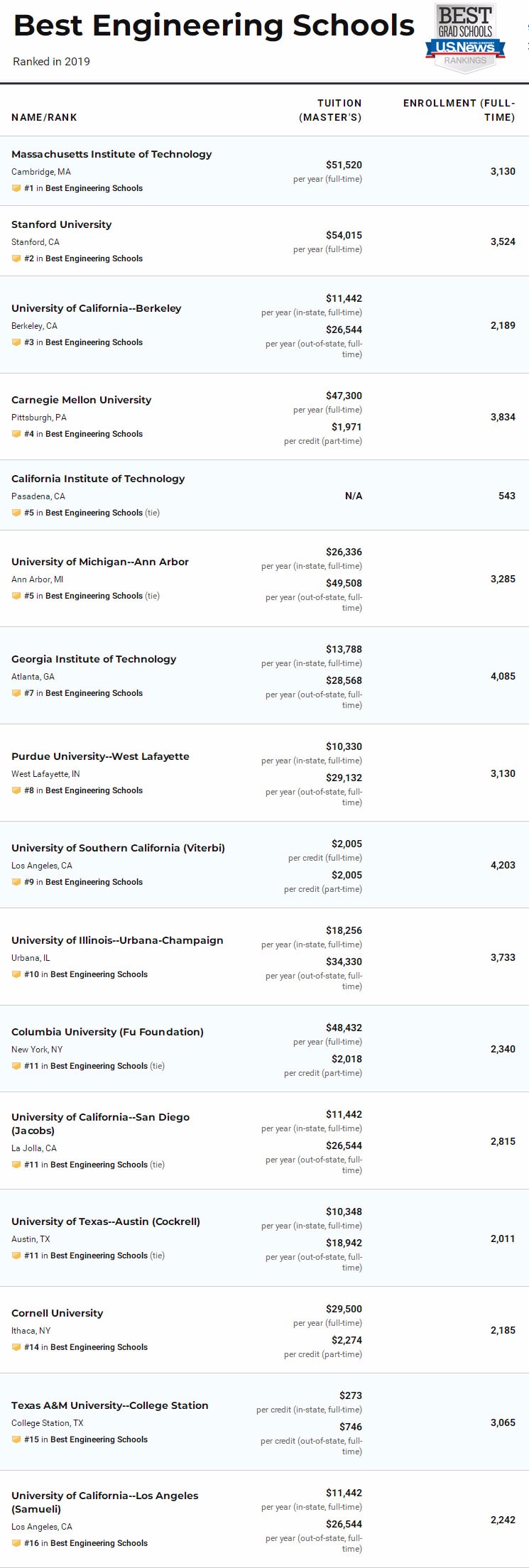 除了总的工程学院排名,今年USNews依然对计算机工程、电子/电气/通信工程、航天航空工程、生物工程、生物医学工程、化学工程、土木工程、环境工程、工业工程、核工程、石油工程、机械工程、材料工程进行了具体排名。