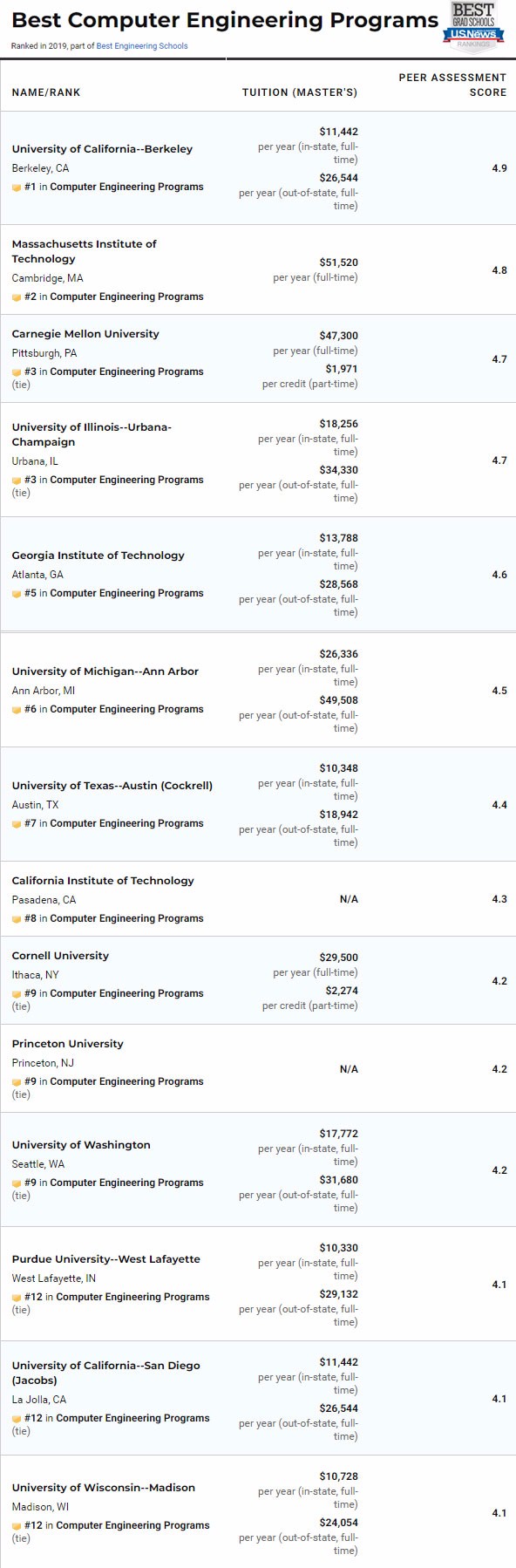 今年计算机工程UCB终于登顶榜首,普渡跌至12位。