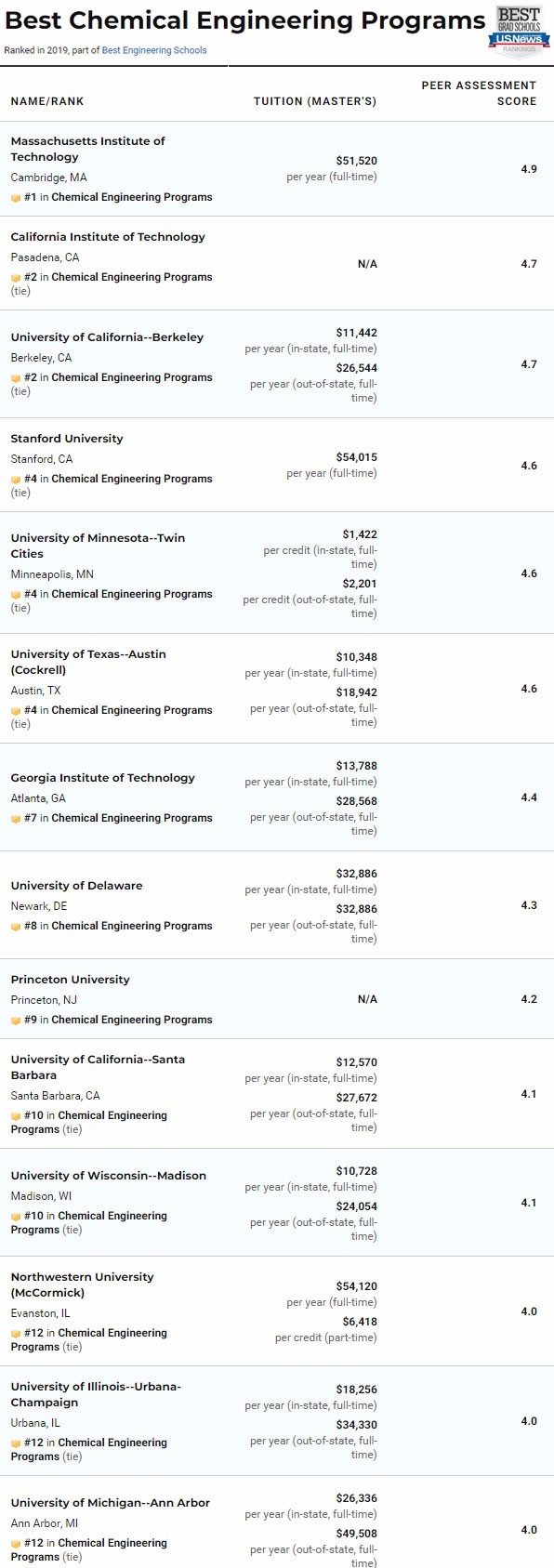 化学工程的排名相对比较稳定,明尼苏达双城与德州奥斯汀、斯坦福并列第4。