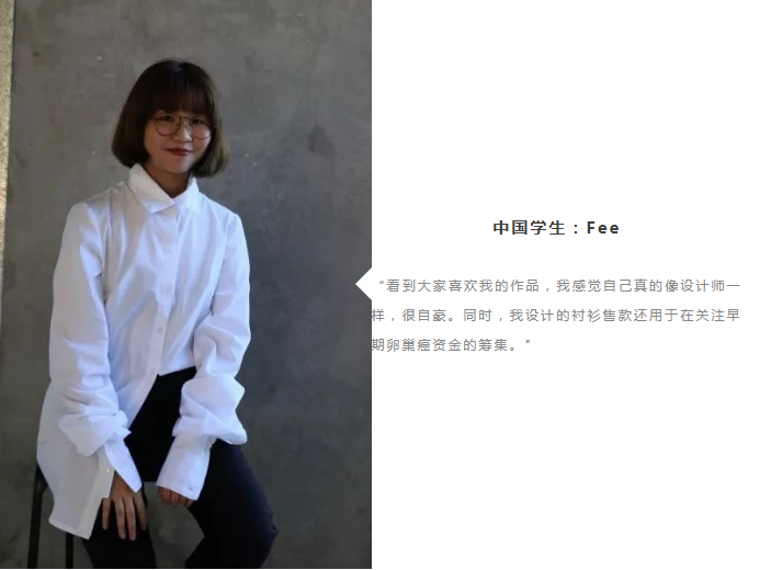 “这次实践经历培养了我的自信,因为我在参与白衬衫慈善项目的宣传中发挥了重要的作用。 设计白衬衫的过程 让我有很强的参与感, 我学到了很多 有关时装设计、时装图纸、面料选择与制作技术的新技能, 我完全沉浸在了创作的过程中”。