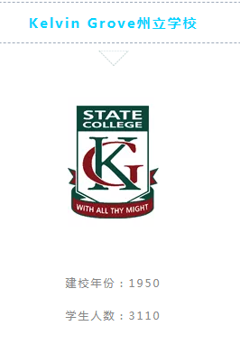Kelvin Grove州立学校位于布里斯班,学校提供小学、中学和高中的课程,能让学生从小学一直上到高中,无需转学。 学校毗邻昆士兰科技大学,与多所大学和行业伙伴都建立了合作关系,以帮助学生未来的职业发展。