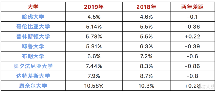 2019年藤校录取率(由低到高排序):