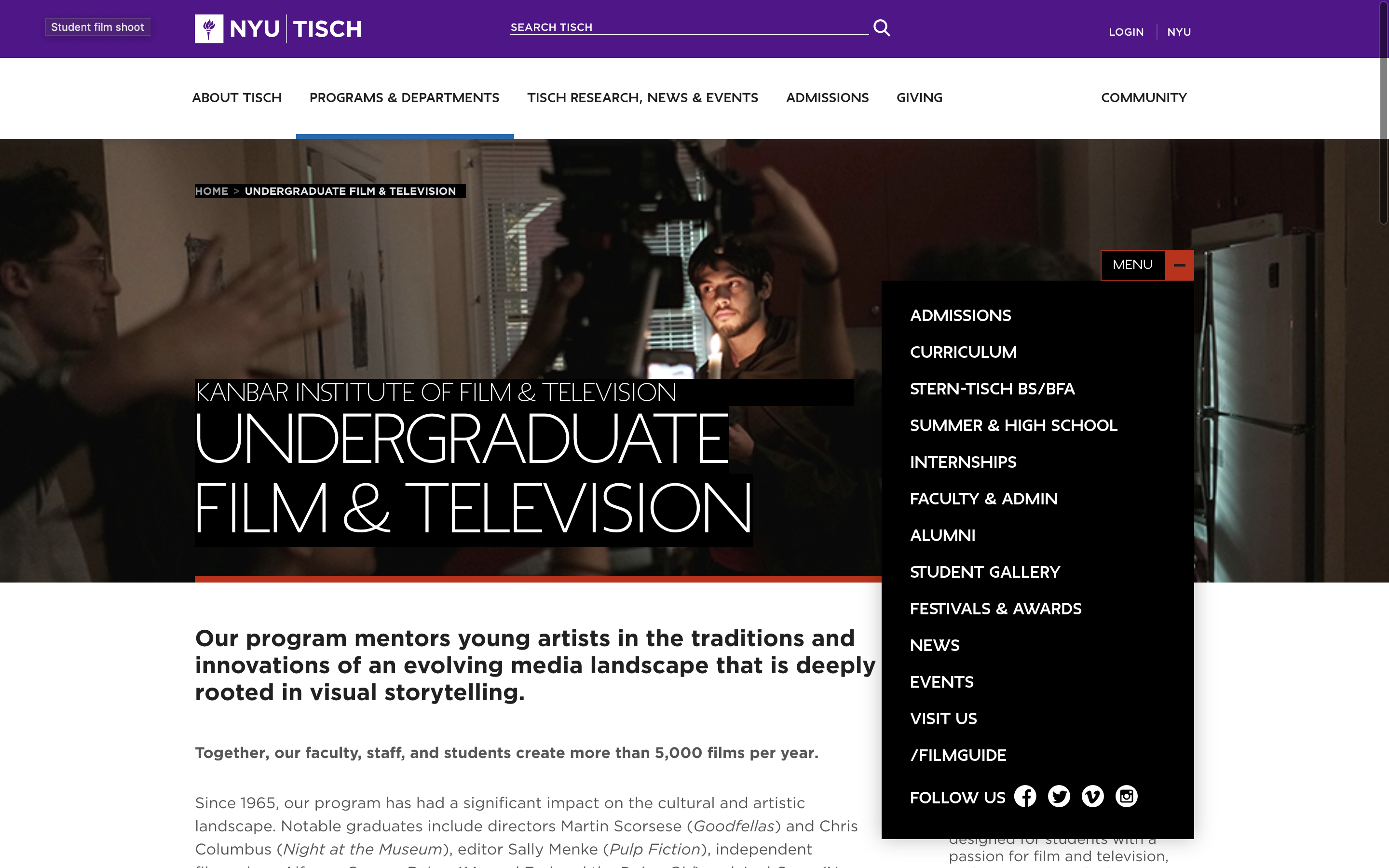 纽约大学帝势艺术学院的影视系与位于好莱坞的南加大影视系齐名。 与西海岸的南加大不同,纽约大学帝势艺术学院融合了好莱坞商业电影与欧洲文学艺术电影的精髓。这所大学共培育出了19位奥斯卡金奖得主 。纽约大学影视系每年的录取率极低,不到5%,堪比影视界的沃顿商学院。