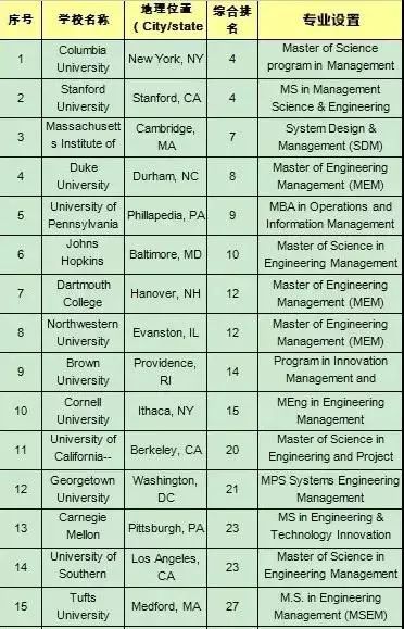 美国TOP100大学中,约 40所 开设工程管理专业。工程管理专业在国外院校命名主要有