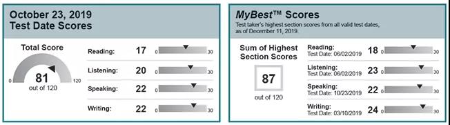 MyBest scores也被称为“superscore”,是考生在过去两年中所有有效托福考试成绩中每部分最高分数的总合。