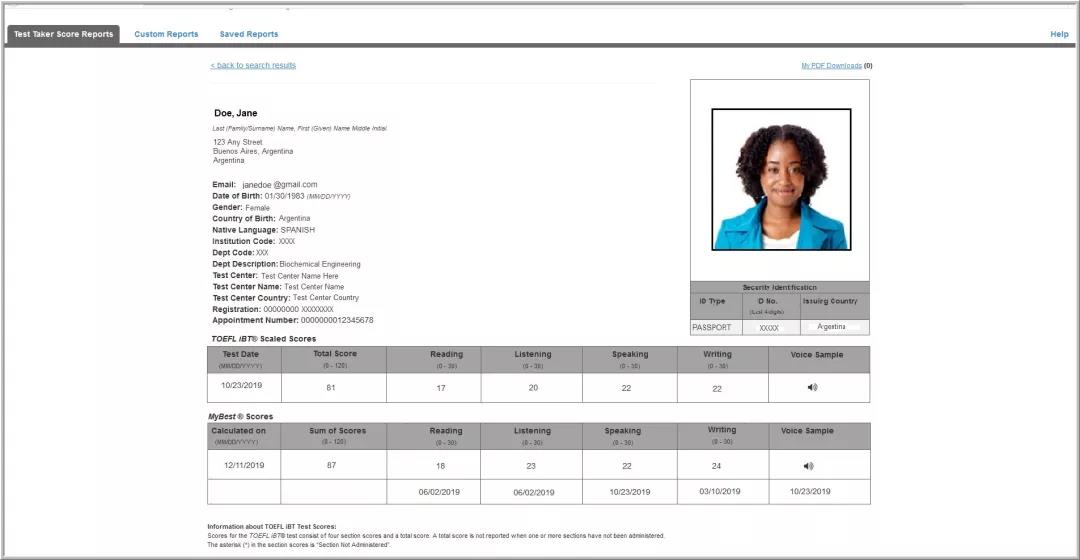 新政策的出台,意味着从2019年8月1日起,考生在递交托福成绩报告时,除了自己所选场次的成绩外,还会显示在过去2年内所有考试的“最佳成绩”(不可选择不显示),如下图: