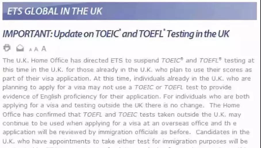 2014年7月1日,英国移民局正式剔除ETS作为认证语言担保方,也就是说,托福成绩将不能作为签证申请者的英语能力证明。