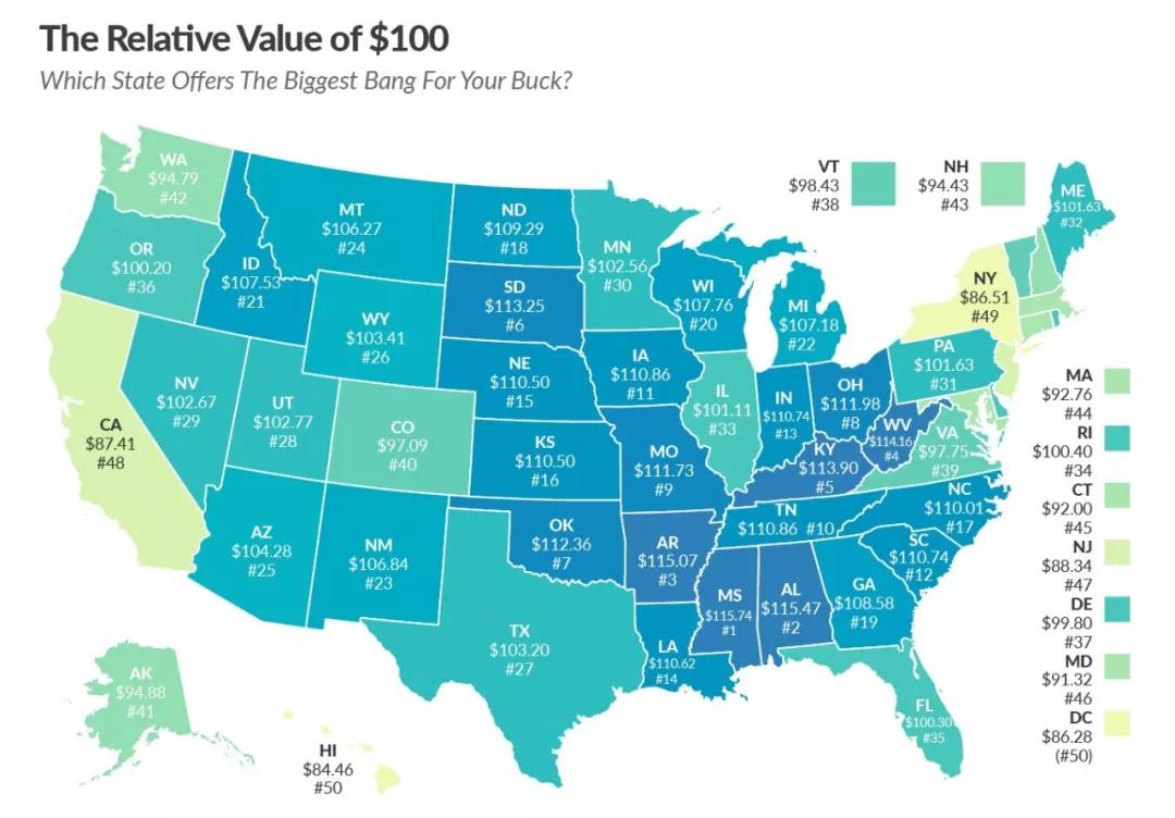 美国税务局(Tax Founation)根据物价数据,在2018年下半年出了个统计:100美元在美国各州的购买力,购买力最低的城市也就是消费水平最高的地区,看看谁那里钱最值钱?