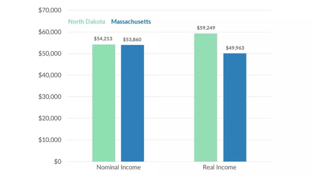 以北达科他州与麻省诸塞州为例,这两个州人均居民收入差不多,差距不超过500刀,但是经过购买力调整,北达科他州的“钱”明显要比麻省诸塞州的“钱”值钱。