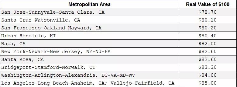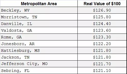 像南达科他州就是一个低价州,密西西比州、阿拉巴马州、阿肯色州也都是购买力超高的地方,而纽约州、加州、新泽西州、夏威夷州就惨了点,100块的钞票只“值”80多。