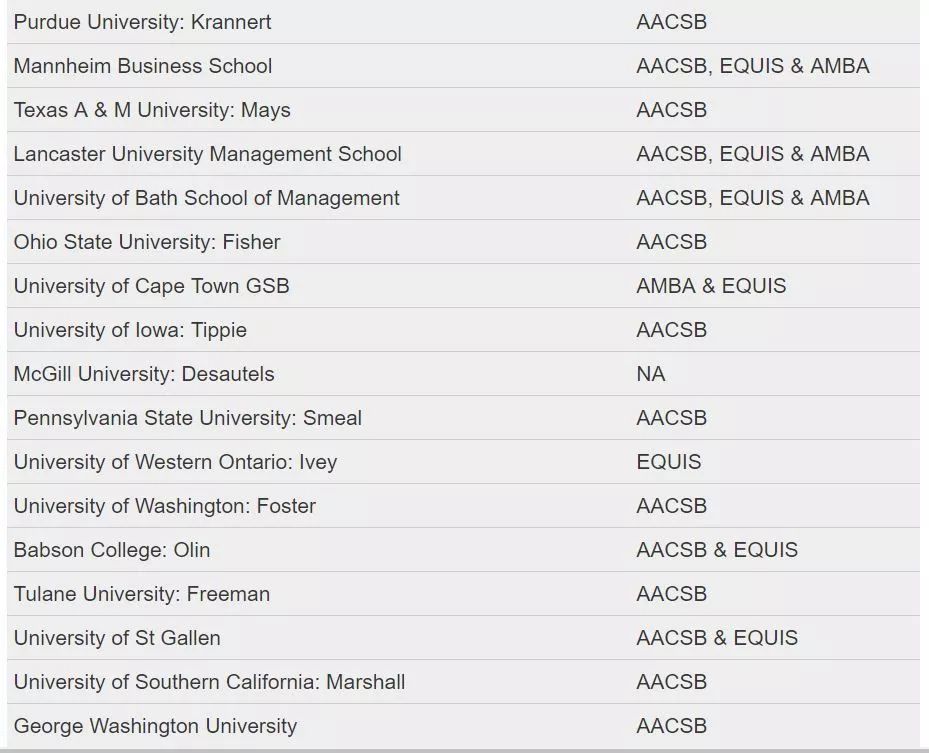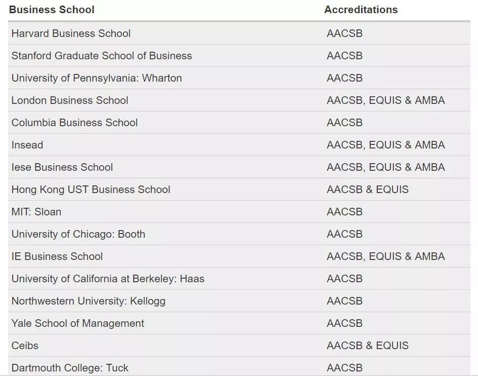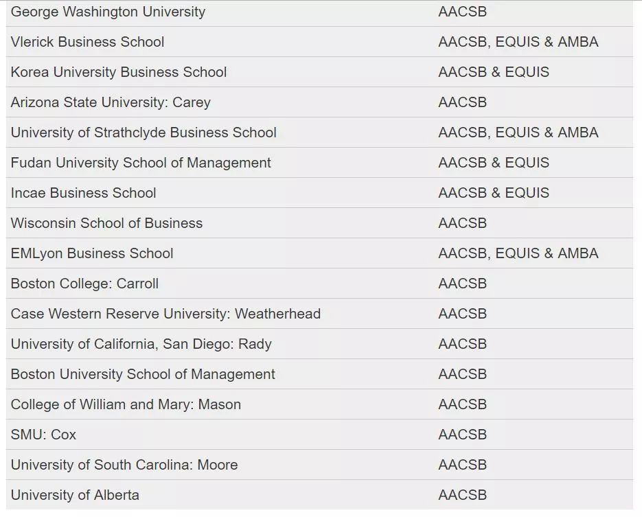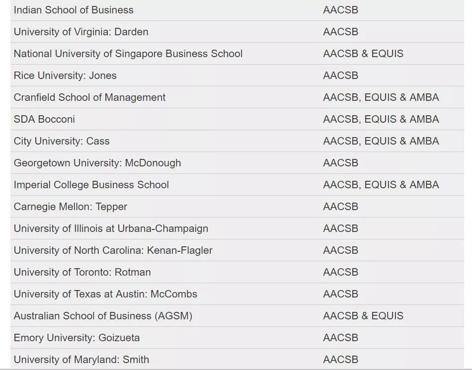 世界上获得AACSB的著名院校有哈佛商学院、沃顿商学院、伦敦商学院等。