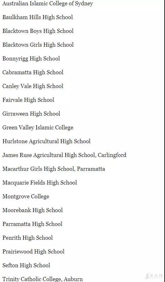悉尼西区和西南地区的学校在3年级和5年级至少有三个学科“高于”或者“远远高于”同类学校的名单(按首写字母顺序进行排列)如下: