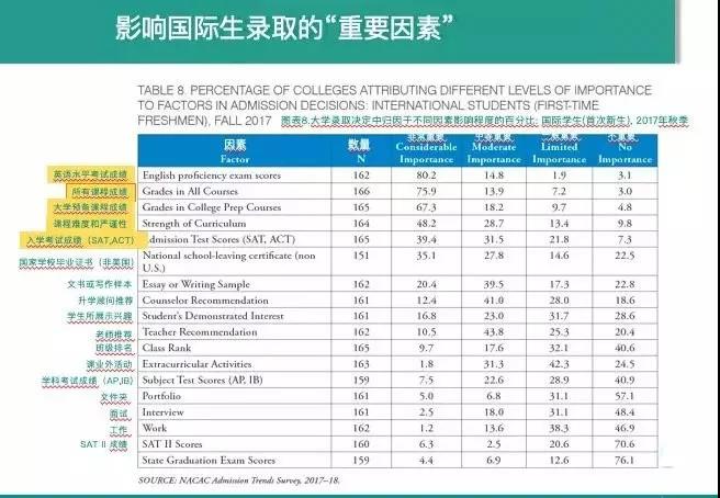 从图中,我们可以看出: 英语水平考试成绩 (TOEFL、雅思、Duolingo)、课程成绩(GPA)、大学预备课程成绩(College Prep course比如AP和honor课程)、入学考试成绩(SAT/ACT)等都是招生官所关注的因素 。