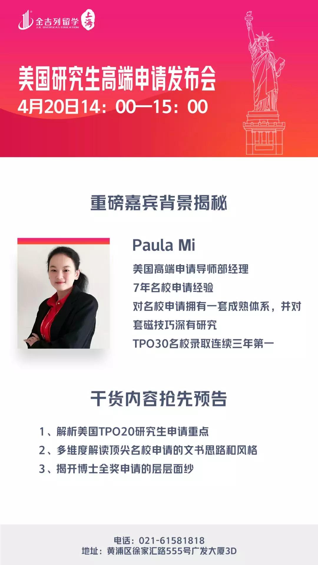 主讲人:Paula Mi 美国高端申请导师部经理 , TPO30名校录取连续三年第一,人称“高端米”
