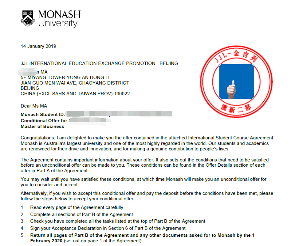 申请规划:为了学生发挥自己的优势,方案肯定是最早的占位。很多不专业的都会说大三上半学期结束才可以申请。完全经验主意。并且不太懂澳洲申请的原则和趋势。结合学生的情况,给学生做了提前规划和文书写作。用刚过审理线的分数,为学生争取到了名校的录取。